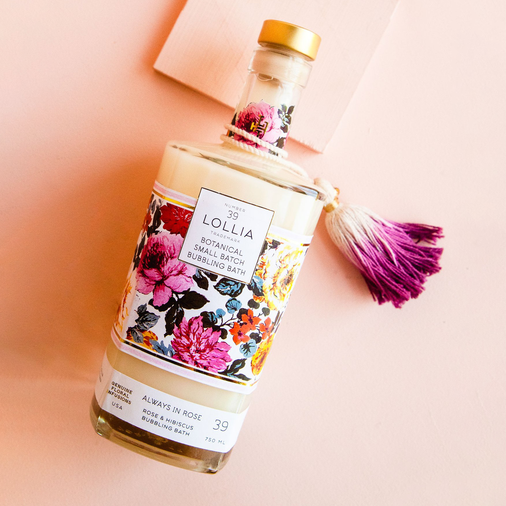 It all comes in a strikingly gorgeous glass bottle decorated in colorful flowers with a signature Lollia cork.